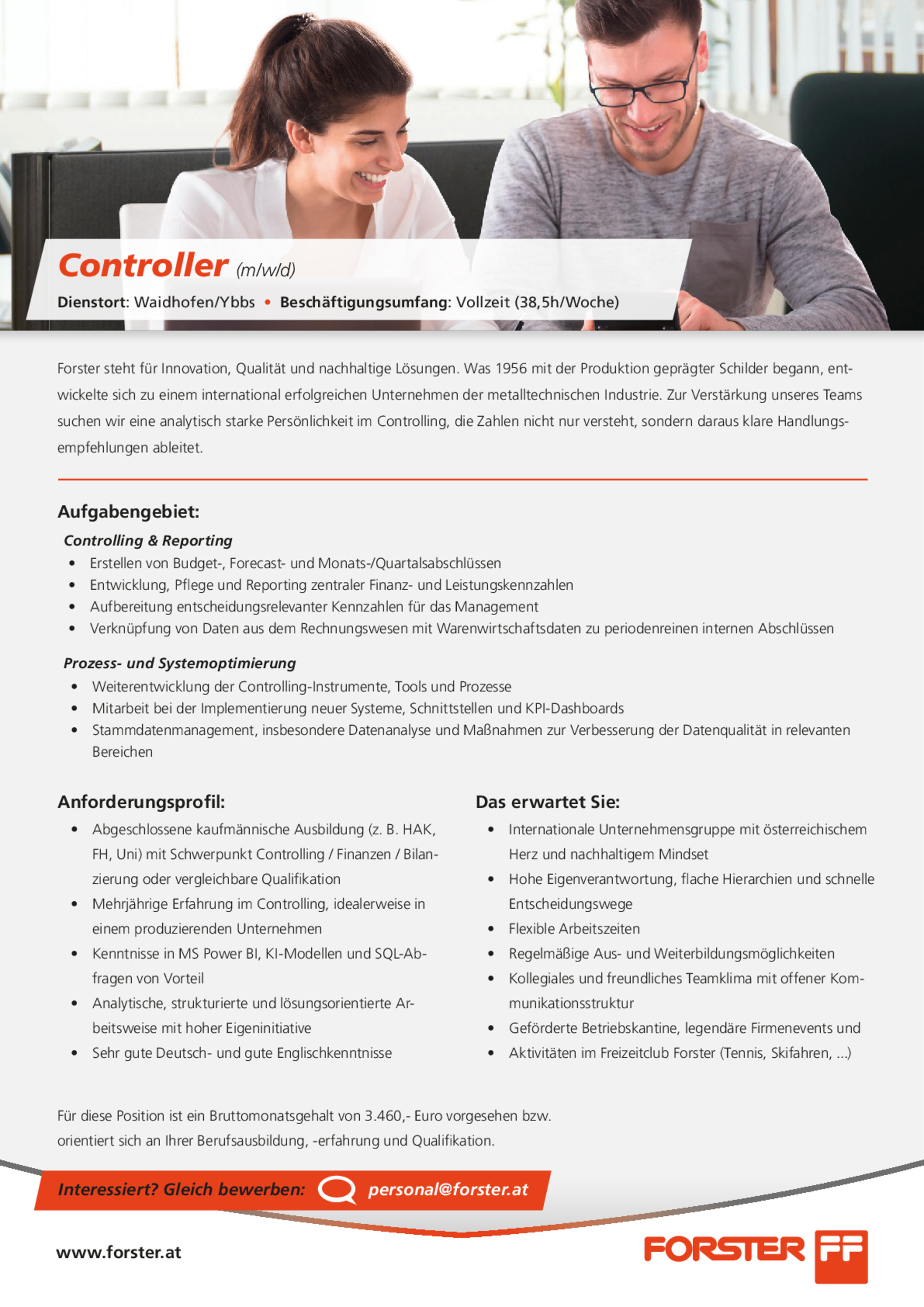 Für diese Position ist ein Bruttomonatsgehalt von 3.460,-- Euro vorgesehen bzw. orientiert sich an Ihrer Berufsausbildung, -erfahrung und Qualifikation.