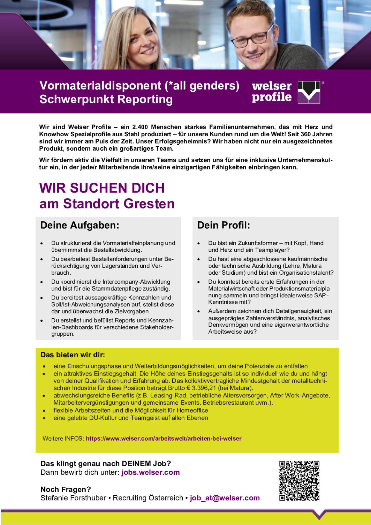 Die Höhe deines Einstiegsgehalts ist so individuell wie du und hängt von deiner Qualifikation und Erfahrung ab. Das kollektivvertragliche Mindestgehalt der metalltechnischen Industrie für diese Position beträgt Brutto € 3.396,21 (bei Matura).