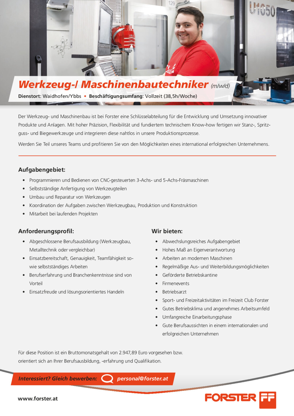 Für diese Position ist ein Bruttomonatslohn von 2.947,89 Euro vorgesehen bzw. orientiert sich an Ihrer Berufsausbildung, -erfahrung und Qualifikation.