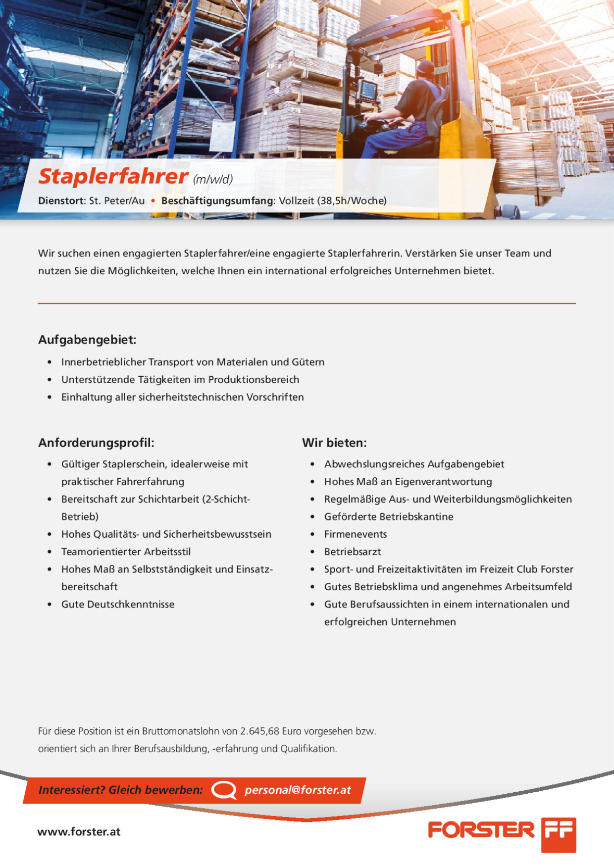Für diese Position ist ein Bruttomonatslohn von 2.645,68 Euro vorgesehen bzw. orientiert sich an Ihrer Berufsausbildung, -erfahrung und Qualifikation.