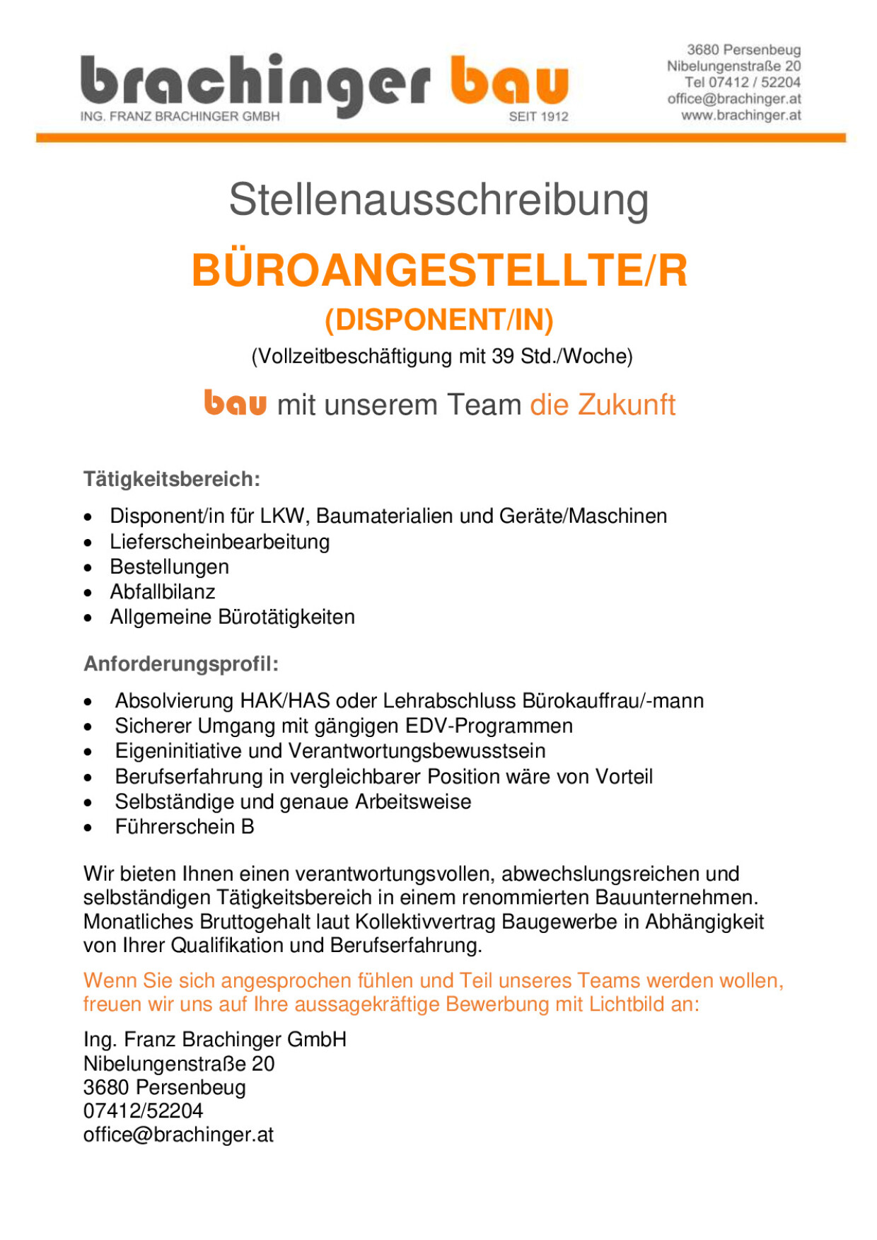 Wir, die Ing. Franz Brachinger GmbH, sind ein renommiertes Bauunternehmen aus dem Bezirk Melk und führen alle Arbeiten durch - von der individuellen Planung bis zur kompletten Fertigstellung eines Bauvorhabens. Neben den Bezirken Melk, Amstetten, Krems, Zwettl, Perg und Scheibbs führen uns unsere Auftraggeber auch in das Gebiet von St. Pölten bis Wien und Wien-Umgebung. Mit der Erfahrung aus langjähriger Tradition und der Aufgeschlossenheit für innovative Bauweisen errichten wir Wunschobjekte für Privatpersonen, Industrie und Gewerbe sowie für die öffentliche Hand. Eine genau durchdachte Planung und eine korrekte Auftragsabwicklung mit gut ausgebildeten und motivierten Mitarbeitern bilden das Fundament auf dem wir bauen. Derzeit beschäftigen wir ca. 120 Mitarbeiter und zählen zu einem bedeutenden Ar-beitgeber in der Region.