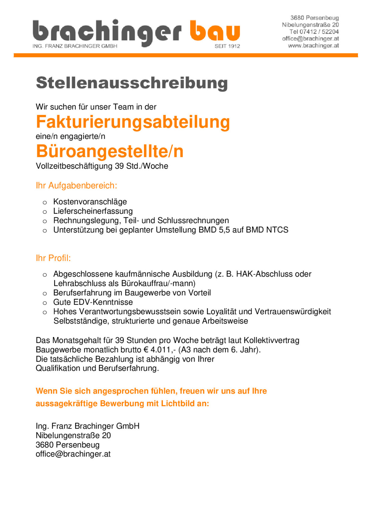 Wir, die Ing. Franz Brachinger GmbH, sind ein renommiertes Bauunternehmen aus dem Bezirk Melk und führen alle Arbeiten durch - von der individuellen Planung bis zur kompletten Fertigstellung eines Bauvorhabens. Neben den Bezirken Melk, Amstetten, Krems, Zwettl, Perg und Scheibbs führen uns unsere Auftraggeber auch in das Gebiet von St. Pölten bis Wien und Wien-Umgebung. Mit der Erfahrung aus langjähriger Tradition und der Aufgeschlossenheit für innovative Bauweisen errichten wir Wunschobjekte für Privatpersonen, Industrie und Gewerbe sowie für die öffentliche Hand. Eine genau durchdachte Planung und eine korrekte Auftragsabwicklung mit gut ausgebildeten und motivierten Mitarbeitern bilden das Fundament auf dem wir bauen. Derzeit beschäftigen wir ca. 120 Mitarbeiter und zählen zu einem bedeutenden Ar-beitgeber in der Region.
