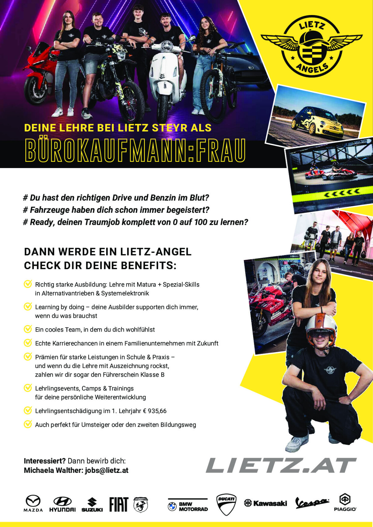 und wenn du die Lehre mit Auszeichnung rockst, zahlen wir dir sogar den Führerschein Klasse B plus Moped/Vespa/Rad für die Dauer der Lehre!