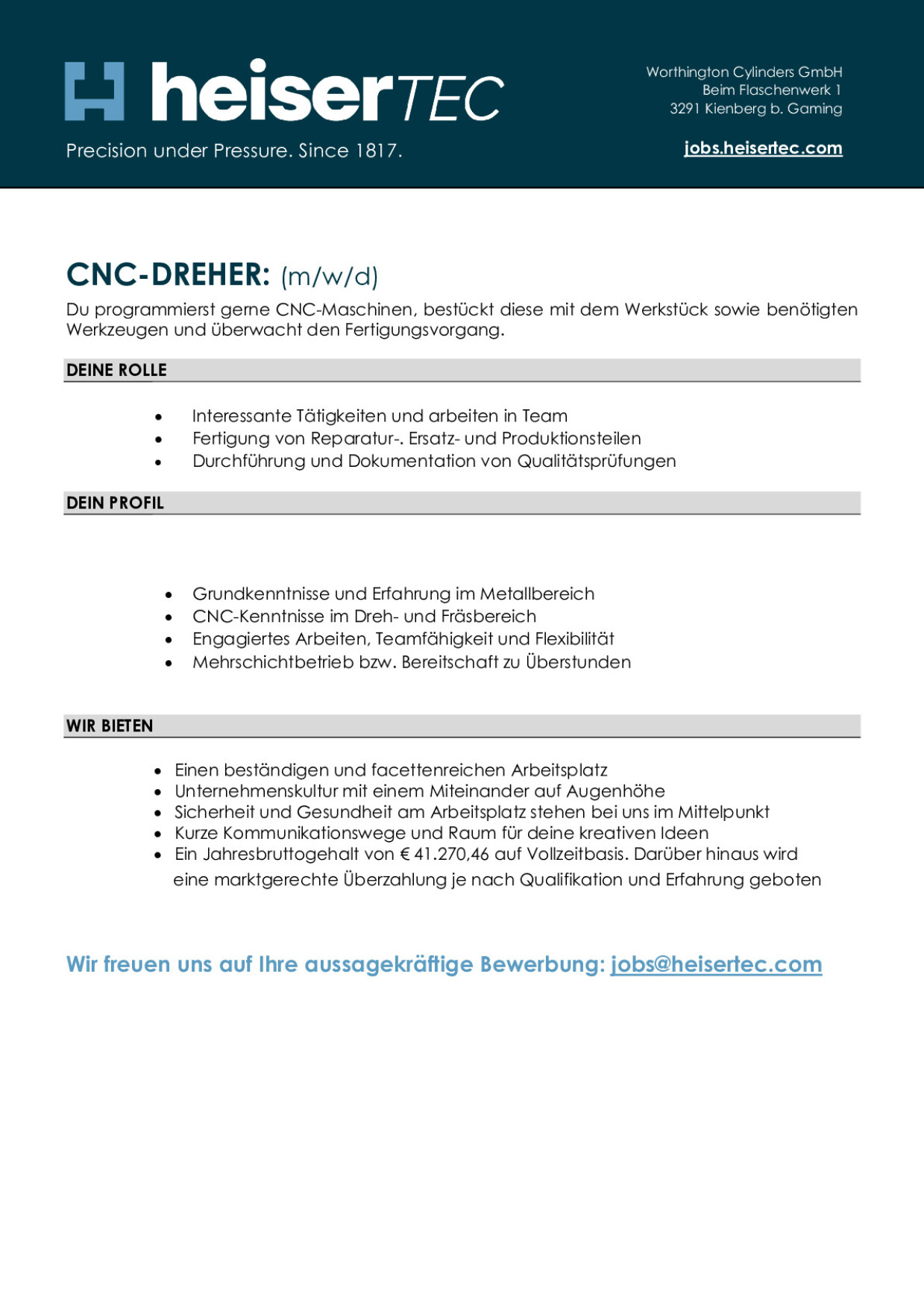 Das Kienberger Traditionsunternehmen heiserTEC zählt zu den weltweit führenden Produzenten von Hochdruckbehältern, die zum Schutz und zur Aufbewahrung unterschiedlicher Gase dienen. Wir beschäftigen am Standort