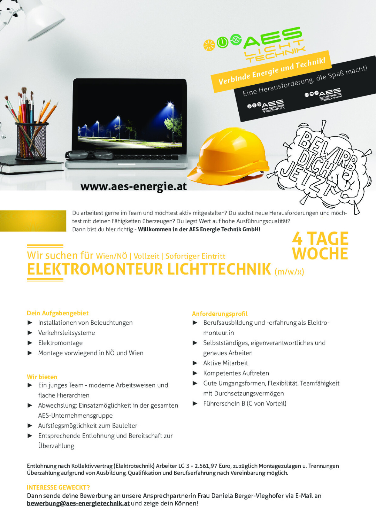 Entlohnung nach Kollektivvertrag (Elektrotechnik) Arbeiter LG 3 - 2.561,97 Euro, zuzüglich Montagezulagen u. Trennungen Überzahlung aufgrund von Ausbildung, Qualifikation und Berufserfahrung nach Vereinbarung möglich.