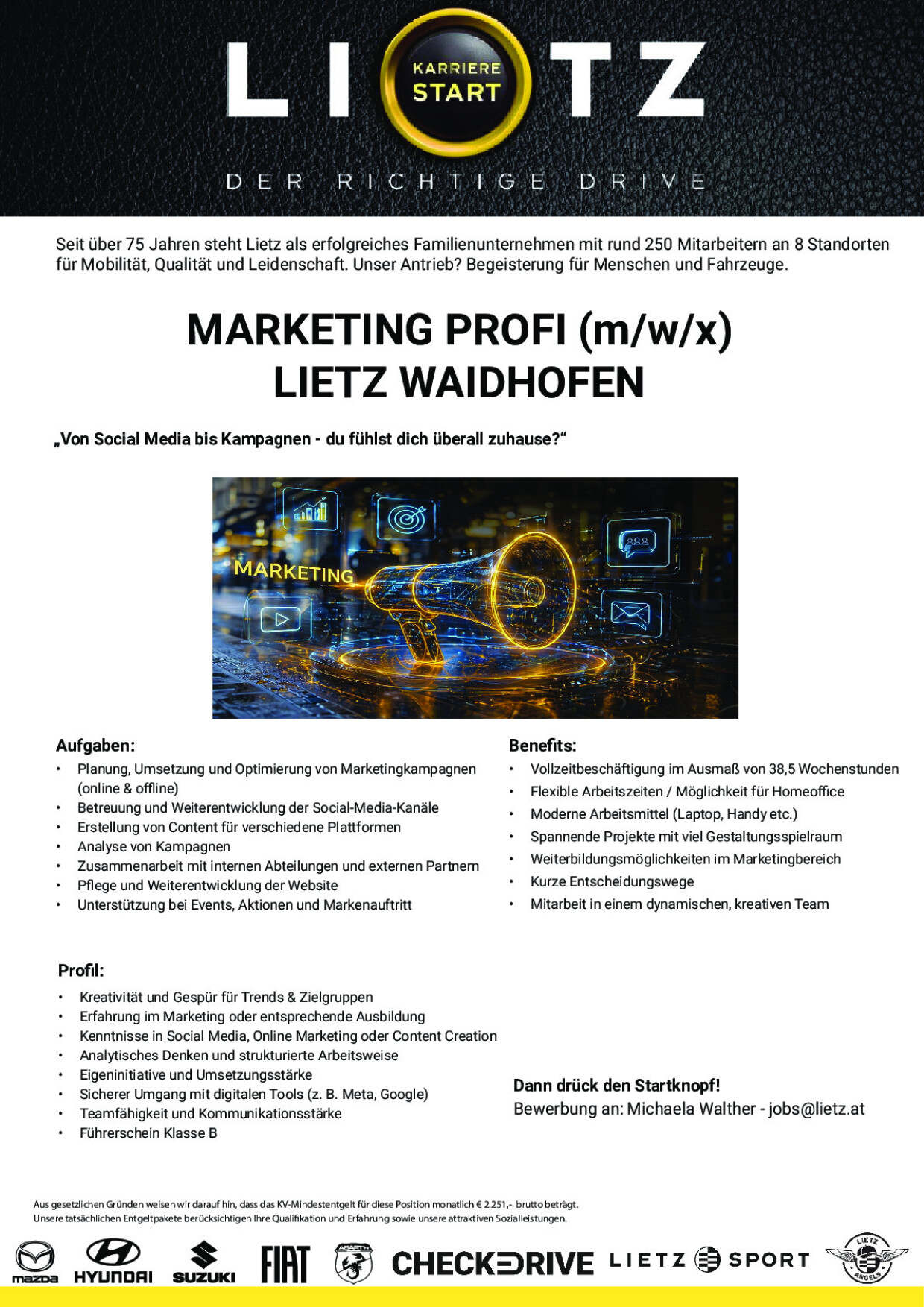 Aus gesetzlichen Gründen weisen wir darauf hin, dass das KV-Mindestentgelt für diese Position monatlich € 2.251,- brutto beträgt.