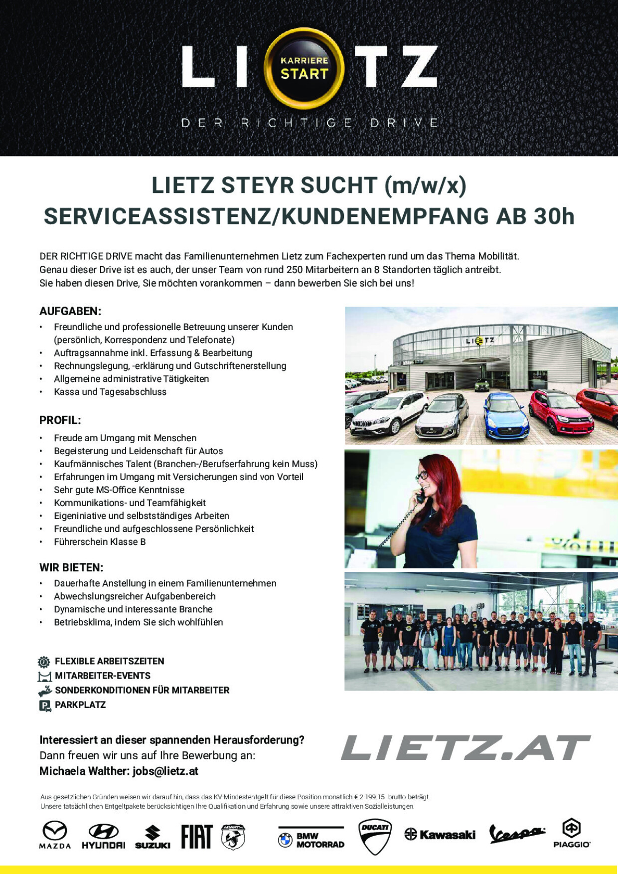 Aus gesetzlichen Gründen weisen wir darauf hin, dass das KV-Mindestentgelt für diese Position monatlich € 2.199,15 brutto beträgt.