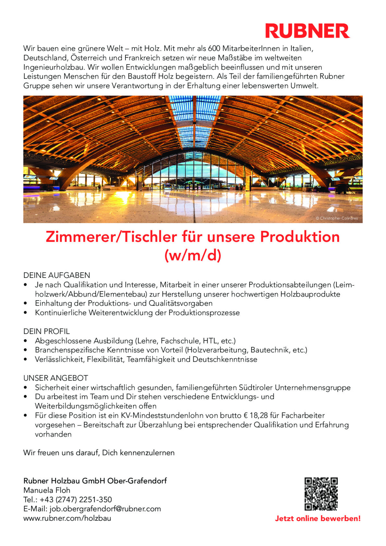 Zimmerer/Tischler für unsere Produktion (w/m/d)